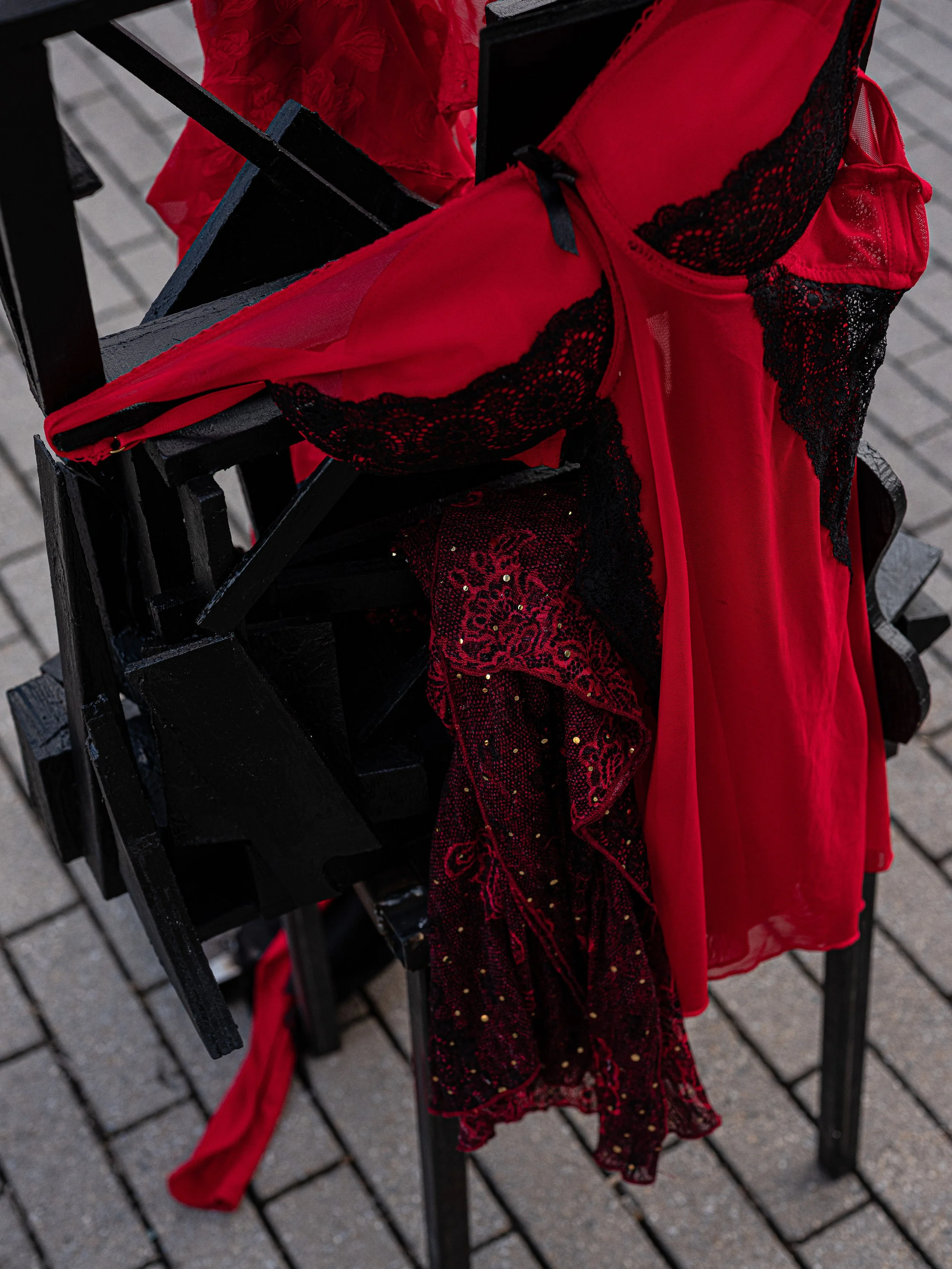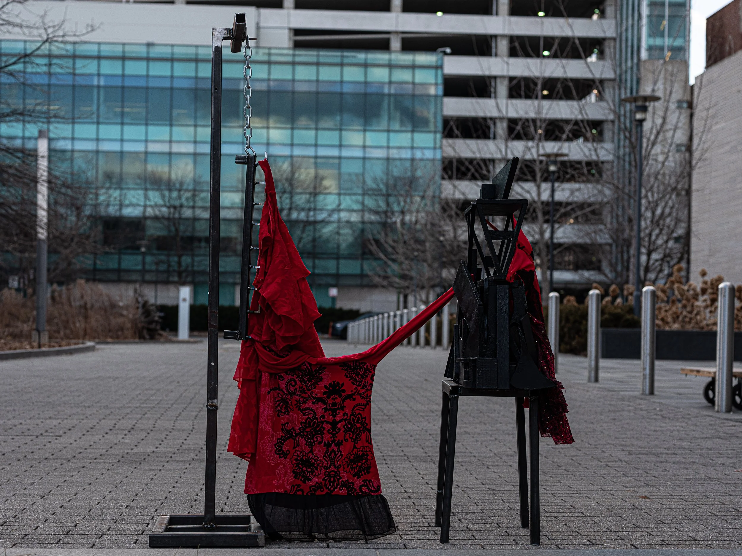 wood base + various pieces of off cut wood, acrylic, gesso, spray paint. steel, chain. clothes from my "to donate" bag.